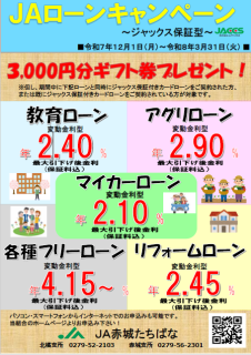 登録金融機関名:赤城橘農業協同組合 登録番号:関東財務局長(登金)第536号 |
